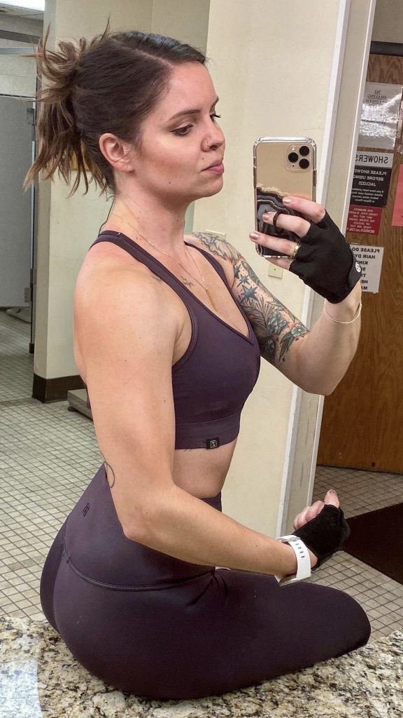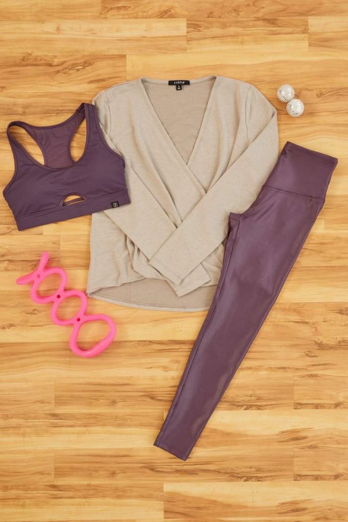 Ellie is coming in hot this month! I immediately knew I wanted the Ultraviolet set as my October pick. Purple and leather-looking?! Sign. Me. Up! This look is right up my ally. I probably won’t use the long-sleeved shirt for workouts, but it’ll be a great lounging around top. The leggings are comfortable and stretchy enough to be comfortable and not too tight, plus they’re high-waisted. I actually got a couple compliments on my outfit and new, darker hair while at the gym last night.