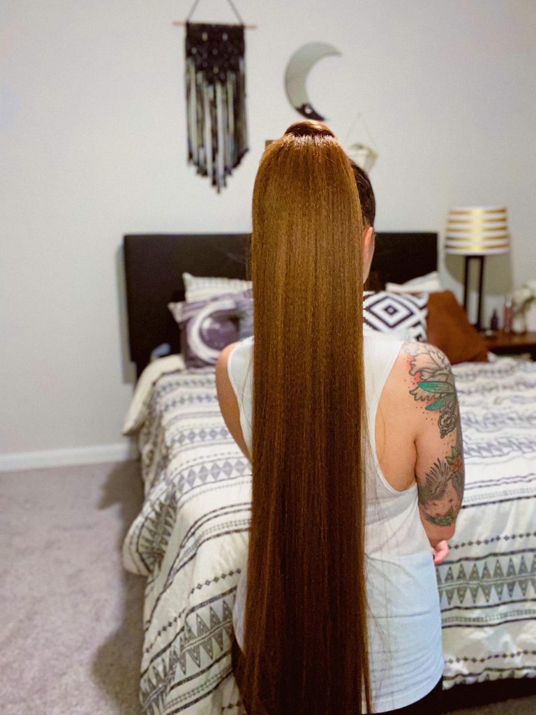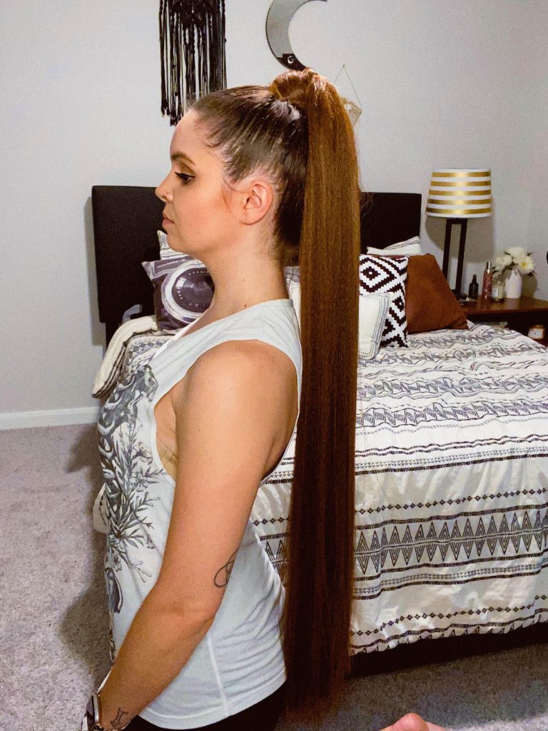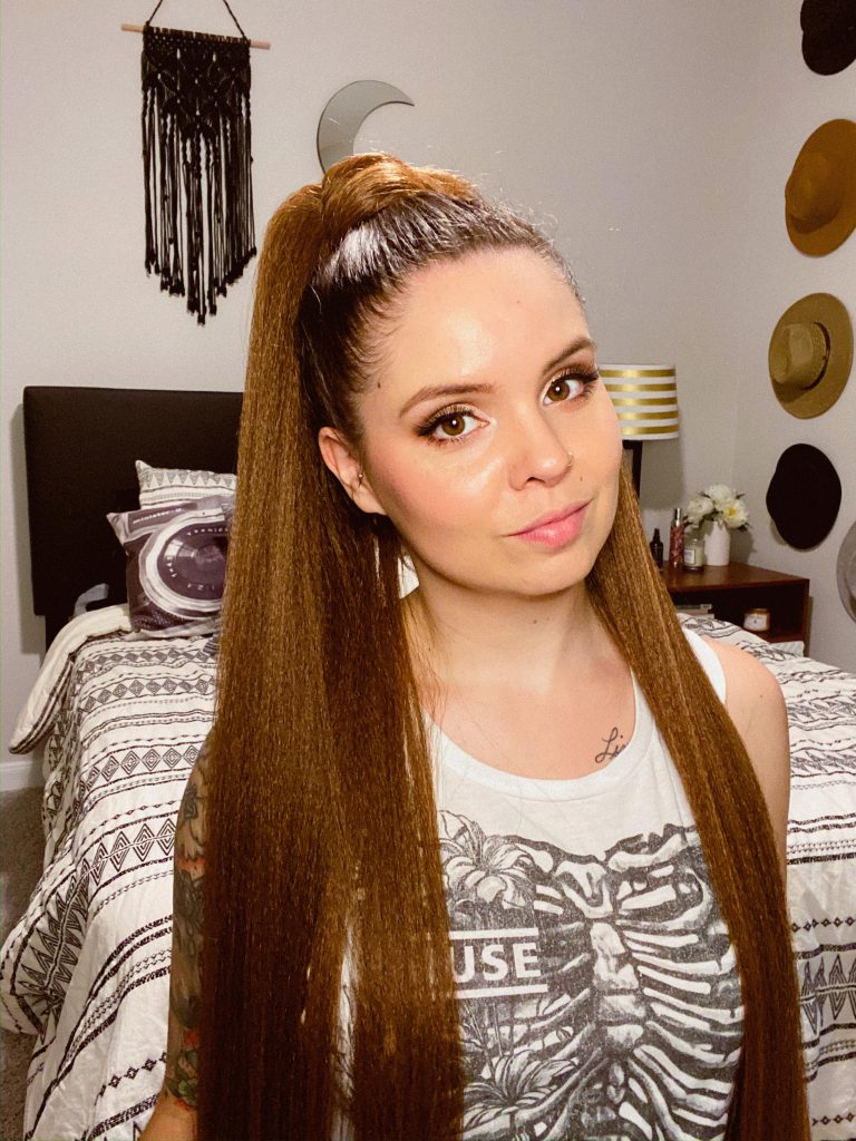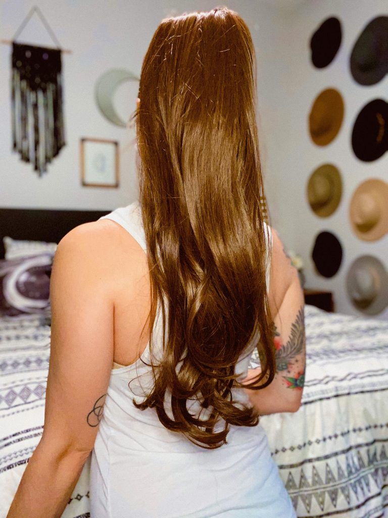Alright, now this one is when you want to really make a statement! It’s super long, right to my butt and has a slight crimp to it to give it some texture. It has a comb at the top that you put right before your ponytail to anchor it. Then you wrap around and velcro it tight around your own pony. Keep wrapping the hair to hide the velcro, same as the Brit!