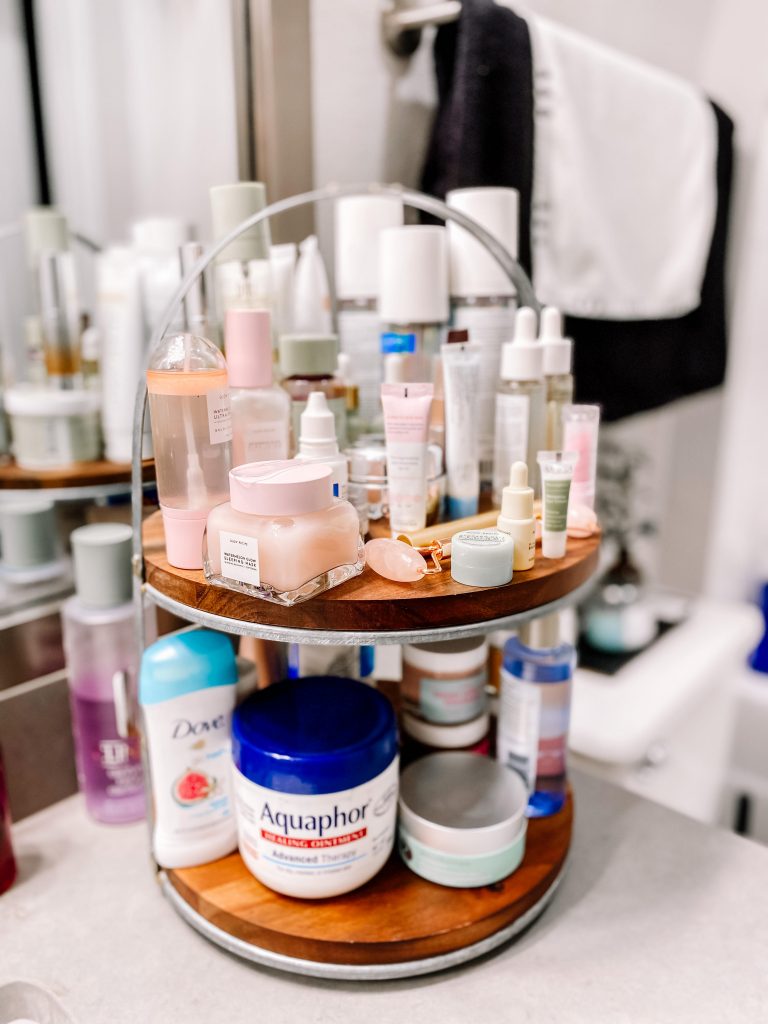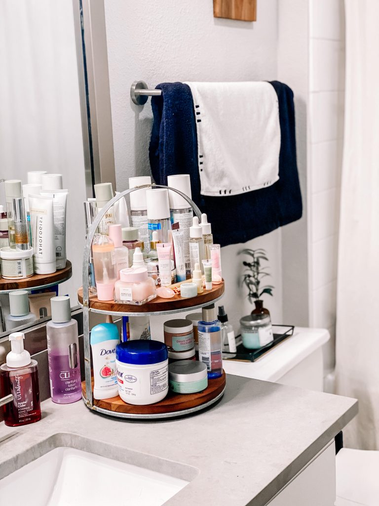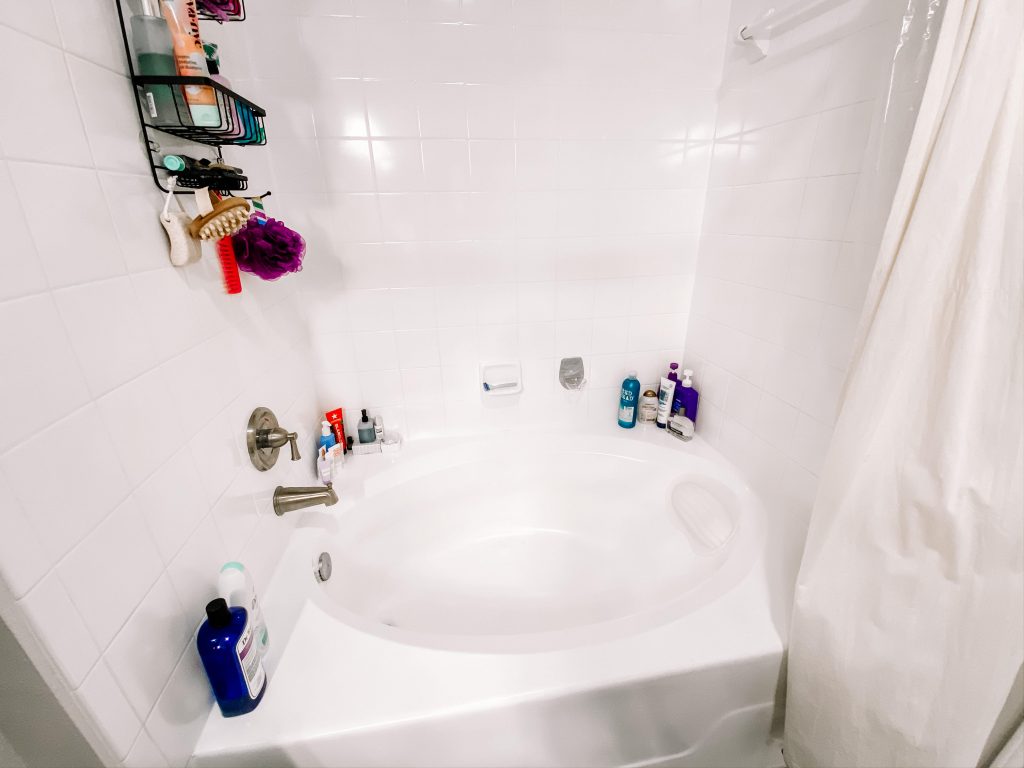 For whatever reason cleaning the bathroom is the chore I’ll gladly tackle. I think it’s because it’s usually a smaller room with no carpet or anything like that. Who knows! I love taking relaxing baths and obviously spend a good amount of time in my bathroom getting ready and whatnot. I don’t do my hair or makeup in my bathroom, but I do my skin routine and bedtime routine here.