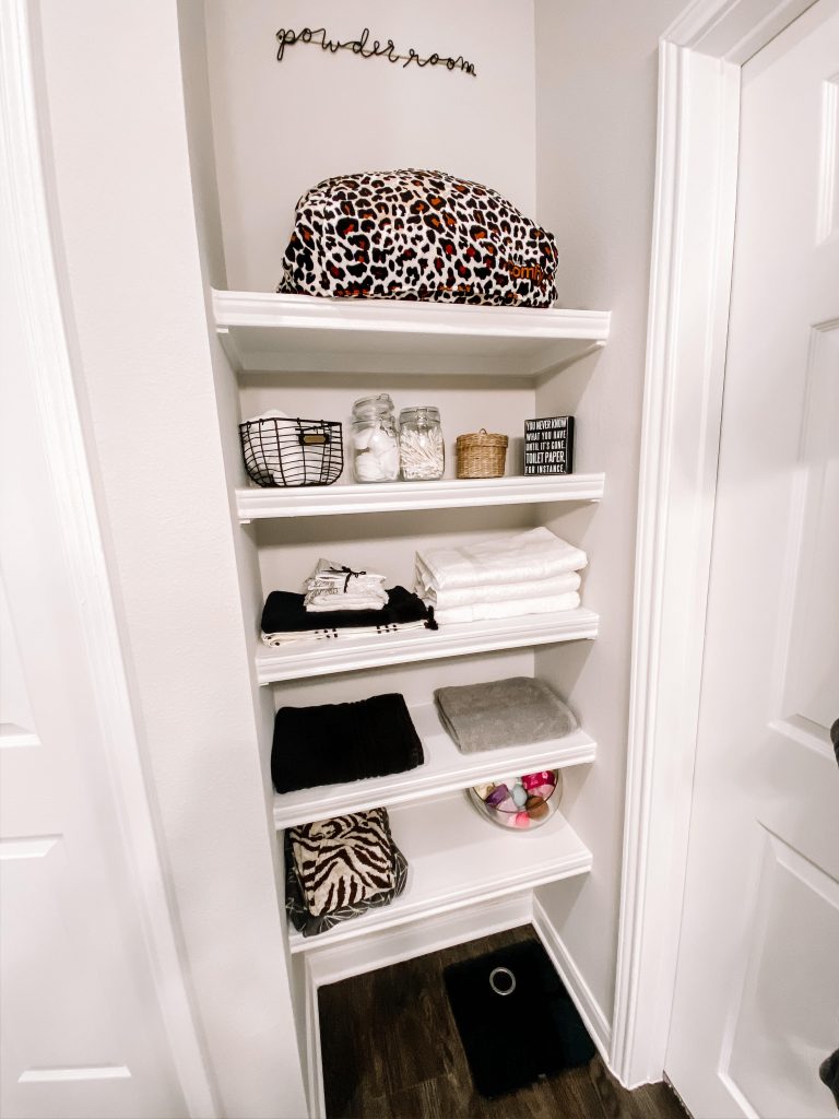 My bathroom definitely carries over the theme that’s throughout the house (black, white, galvanized steel, + wood accents) and I think it’s finally complete!