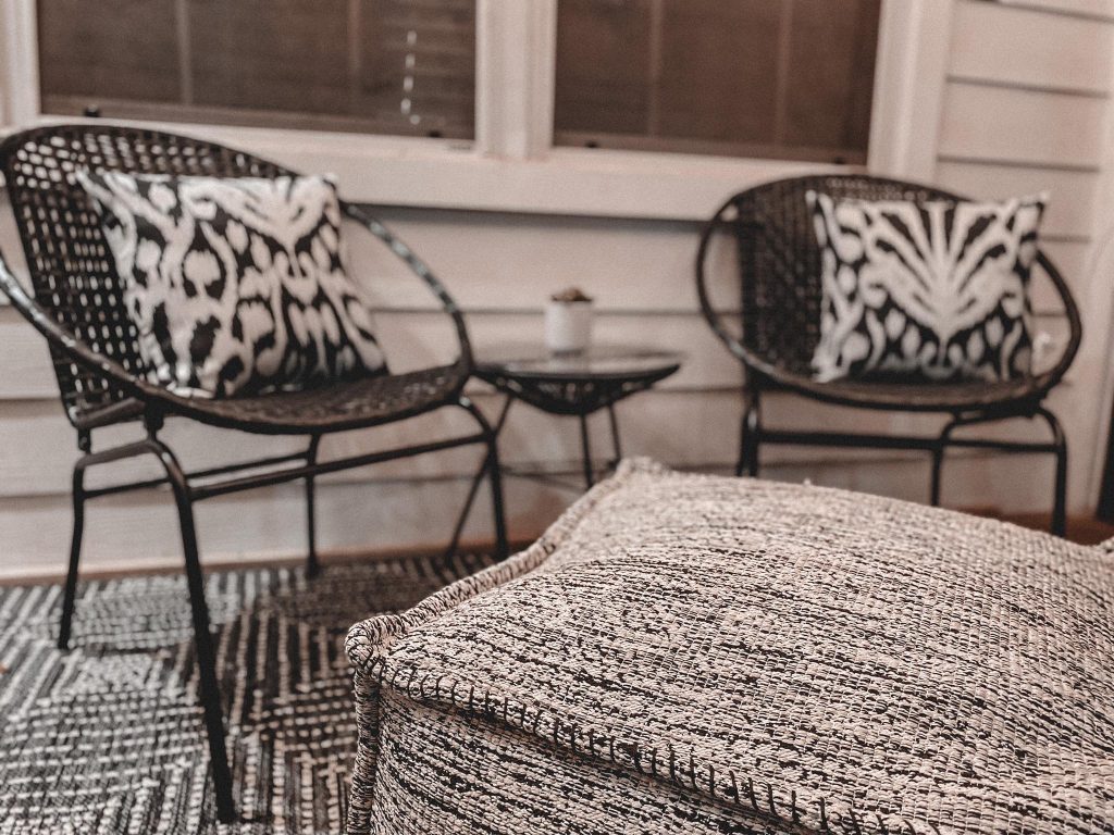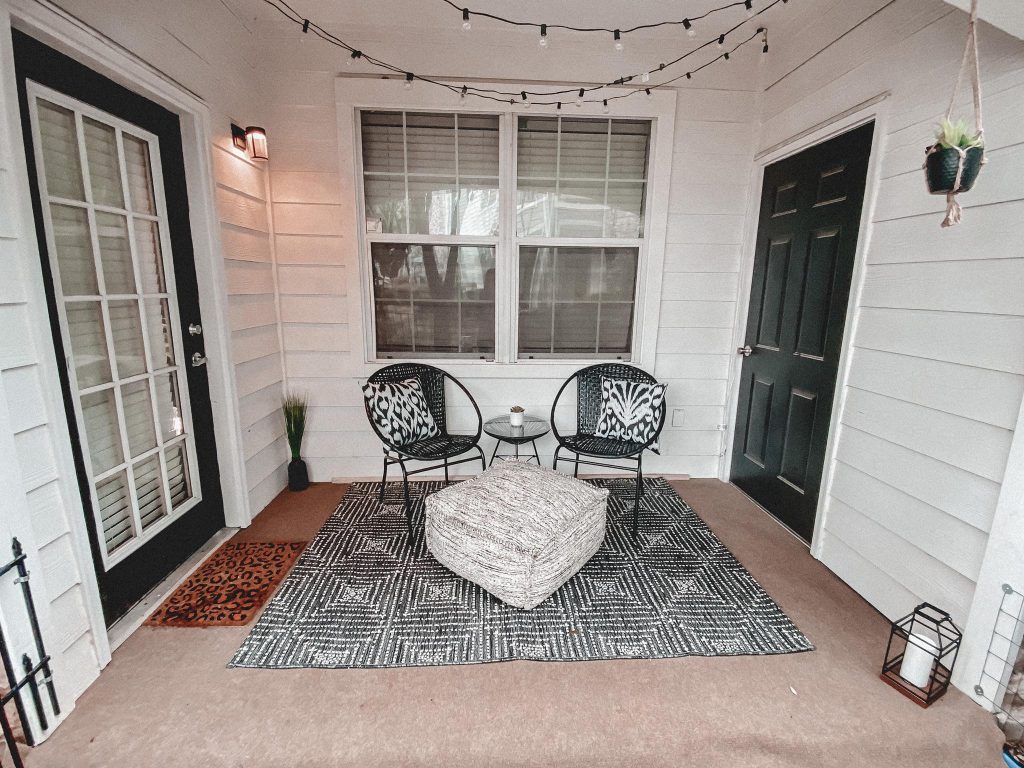 I lucked out with my apartment in Austin and have a cute little fenced in backyard. I wanted to take advantage of the covered patio and create a little sitting spot for me to relax while the dogs can be outside.
